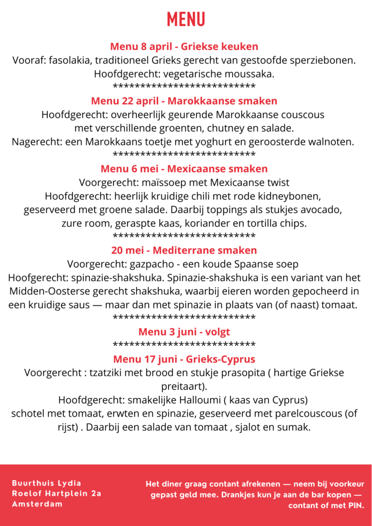 Wilt u mee-eten? Meld u dan uiterlijk maandagmiddag 12.00 uur aan via buurtmaaltijd@buurthuislydia.nl (maximaal 25 personen)